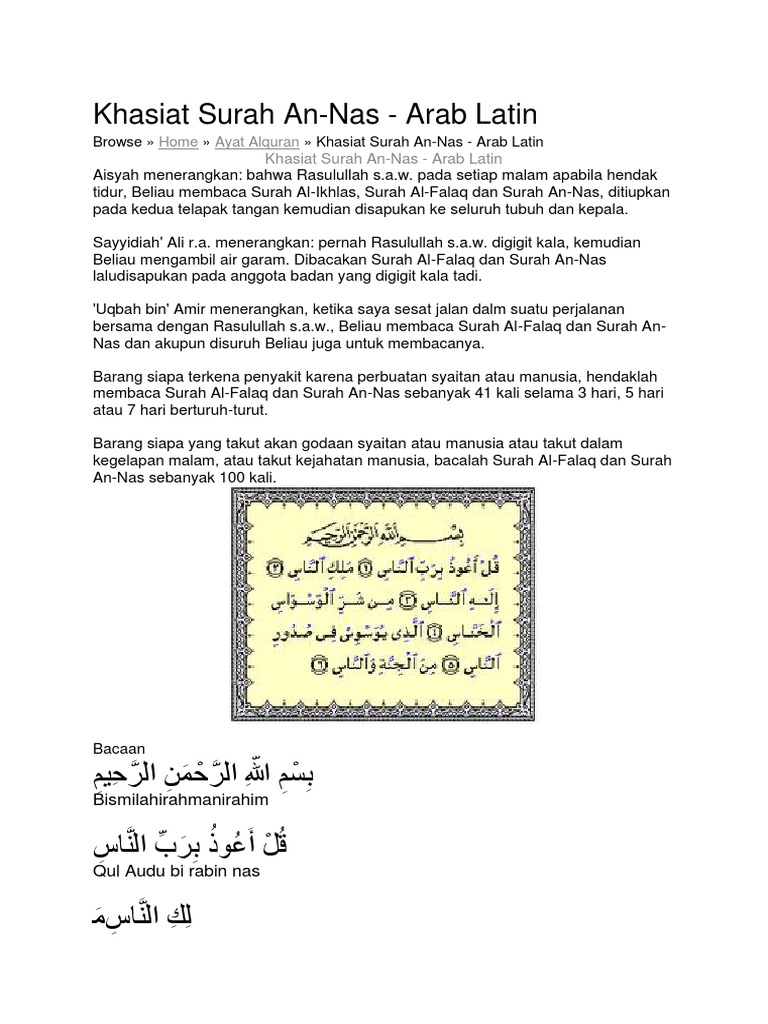Kelebihan Dan Tafsir Surah An Nas Shafiqolbu from imgv2-1-f.scribdassets.com Al quran digital online surat an nas bacaan arab, latin & terjemahan indonesia. (114/1) kul aoozu bi raabbin neas(neasi). Dari kejahatan (bisikan) syaitan yang bersembunyi , yang membisikkan (kejahatan) ke dalam dada manusia. Listen surah nas audio mp3 al quran on islamicfinder. Read or listen al quran e pak online with tarjuma (translation) and tafseer. Nama an naas diambil dari an naas yang berulang kali disebut dalam surat ini yang artinya manusia. Ia terdiri daripada enam ayat dan tergolong dalam surah makkiyyah (turun sebelum hijrah). 4 oct 6, 2017 1.