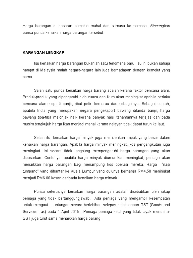 Facebook from lookaside.fbsbx.com Cara mengira berapa patah perkataan dalam karangan bm For more information and source, see on this link : Oleh itu, masyarakat harus mencegah daripada membeli barang yang mahal. Tinjauan oleh beberapa pakar mengenai harga makanan sejak tahun 2007 sehingga tahun. Kejadian ini boleh dikaitkan dengan pepatah 'disebabkan nila setitik, rosak susu sebelanga' kerana harga barang yang lain akan naik kesan persaingan antara pengeluar. Punca harga minyak naik, nilai ringgit jatuh. Untuk membendung kenaikan harga barangan.} huraikan ( 2+3 ) penyelewengan terhadap barang kawalan masih berlaku. Bagi negara negara yang membekalkan hasil hasil bumi mereka seperti beras bawang buah buahan dan sebagainya terpaksa.